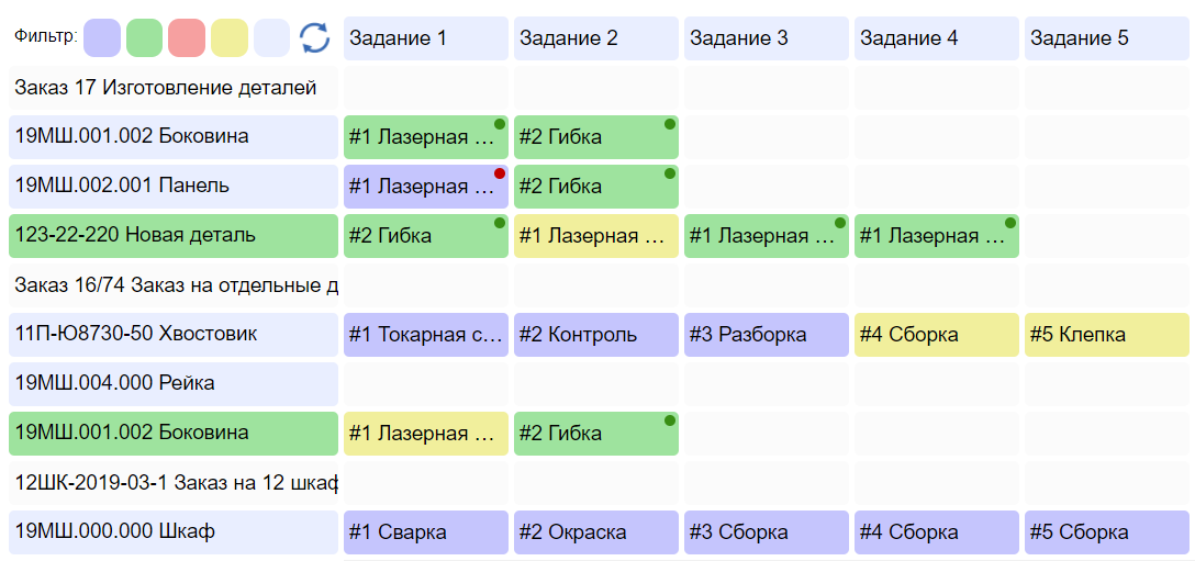 При помощи фильтра можно вывести позиции с соотвествующим статусом. Находящиемся в работе, завершенные, отмененные и ряд других. Клик по заданию выводит его в развернутом виде.