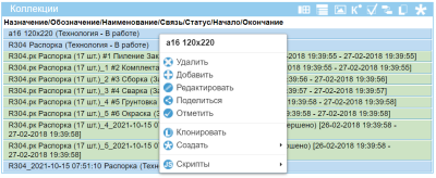 Блок коллекции заполняется у номнеклатуры, коллекции и компонент. Как правило это список вариантов состава изделия, технологии изготовления, сформированных заявок и приходных документов.