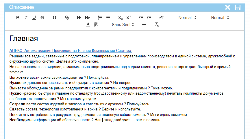 В этом блоке заносится любая поясняющая иформации к объекту системы в html формате. Поддерживается также занесение данных из ранее подготовленных источников при помощи копирования и вставки. Для ведения информации используется встроенный редактор