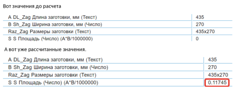 Запускает расчет по формуле. По нажатии на кнопку ”Сохранить” рассчитанные значения сохраняются. Следует соблюдать очередность параметров, ко моменту появления его в формуле его значение должно быть определено (введено или рассчитано его значение. В примере вычисляется площадь в квадратных метрах, исходя из значений параметров длины и и ширины заготовки.