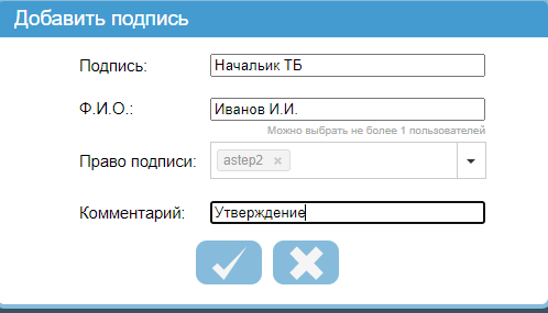 В поле «Подпись» заносится должность, в поле «Ф.И.О.» заносится фамилия и имя подписывающего,, в поле «Право подписи» заполнятеся аккаунт пользователя, который может поставить подпись. Это может быть и групповой аккаунт. В этом случае любой из пользователей-членов группы будет иметь право полставить подпись. В Поле «Комментарий» заносится поясняющая инфомация.