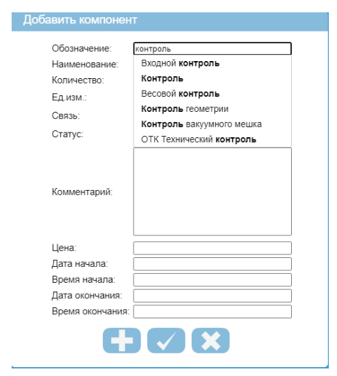 При вводе значения в поле “Обозначение” подбирается подходящая по условию номенклатура, которая может быть выбрана, или же при отсутствии таковой в справочнике вводится ее обозначение и наименование в соответствующие поля, и она добавляется в справочник номенклатуры в категорию “Входящие” или же в папку по умолчанию. Этот режим позволяет одновременно с созданием коллекции формировать и справочник номенклатуры. Аналогичным образом производится добавление в блоки «Параметры», «Коллекции», «Номенклатура».