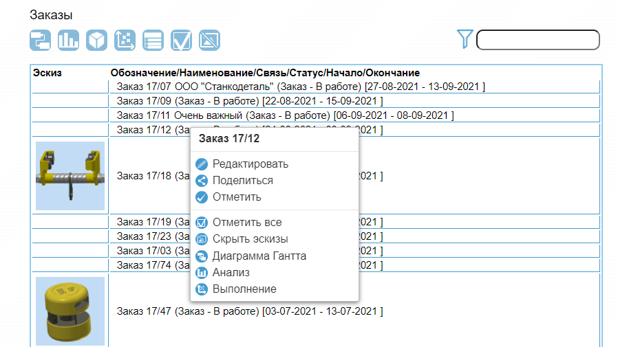 Показать эскизы, назначенные производственным заказам.