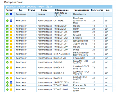 Перед тем как нажать на кнопку “Выполнить импорт” желательно выполнить проверку, нажав на кнопку “Проверить”. По ее нажатии в базе системы проверяется наличие номенклатурных позиций, коллекций и параметров, а также связей и единиц измерения. Проверка проводится по обозначениям. Если в базе нет номенклатуры или коллекции, то они будут созданы, что бывает нежелательным, если в файле импорта что-то записано ошибочно. Напротив позиций которые не найдены, выводится восклицательный знак, а те, которые в базе присутствуют, помечаются галочкой. Если в базе нет параметров, связей и единиц измерения с обозначениями как в файле, то они будут проигнорированы. Значения параметров не будут записаны, а в полях, где должны быть связи и единицы измерения будет пусто, но их можно будет отредактировать средствами системы, а вот параметры не будут занесены вместе со значениями.
