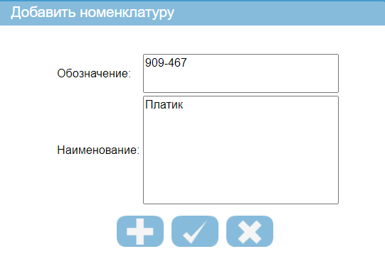 При добавлении номенклатуры в справочник следует заполнить обозначение и наименование.