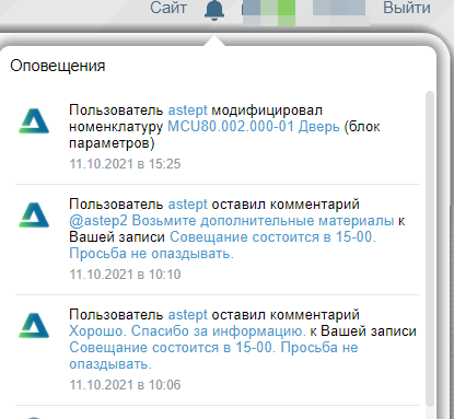 Если есть непрочитанные оповещения, то «Колокольчик» будет зеленым. Клик по ссылке в списке оповещений открывает тот объект в котором совершено действие или будет открыто обсуждение объекта, где упомянут пользователь.