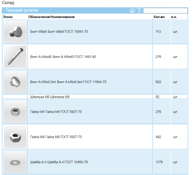 В этом режиме выводится текущий остаток на складах. Информация выводится по выделенным номенклатурным позициям. Этот же режим вызывается из «Производство»-«Склад». В этом случае выводится остаток по всем позициям, движение по которым когда либо производилос в системе.