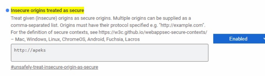 Выставить этот флаг в Enabled и добавить в в список адрес сайт, где размещена система. После этого перезапустить браузер. Появится кнопка внизу страницы - нажать на нее. Блокировка с камеры будет снята.