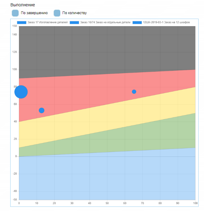 Каждый «Шарик» это отдельный заказ. Цем больше он по размеру, тем более трудоемок. Чем он выше по вертикали, тем выше угроза его невыполнения, чем дальше влево он по оси X, тем большше количество работ сделано. Если щелкнуть по шарику, то будет выведен список позиций по заказу. По оси Y откладывется в процентах прошедшее календарное время, а по оси X - технологическое время. Переключатель «По завершению» учитывает только полностью завершенные задания, а переключатель «Количесвто» не берет в расчет трудоемкость, а учитывает только количество произвденнех позиций заказа. На графифике голубым отображена зона опережения запуска, т.е. детали уже делаются, но срок их по календарю еще не наступил. В зеленую зону попадают заказы, которые быстрее выполняются чем предусмотрено, в желтой зоне находятся заказы, проходящие по графику - прошедшее календарное врем примерно соотвествует технологическому, в красную зону попадают заказы у которых прошеднее календарное время больше технолгического, именно для них уже появляется угроза невыполнения в срок, Черная зона - это уже сорванные заказы. Этот режим является средством для руководителя, обращающего его внимание на те заказы, которые могут быть сорваны.