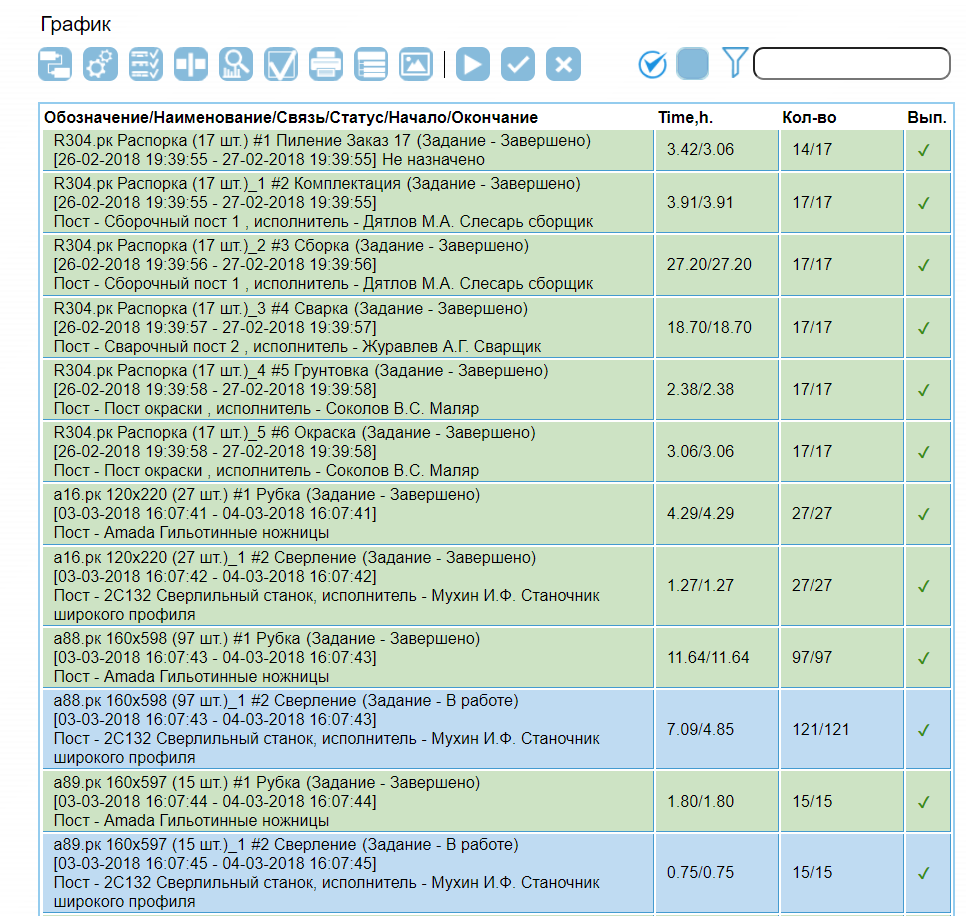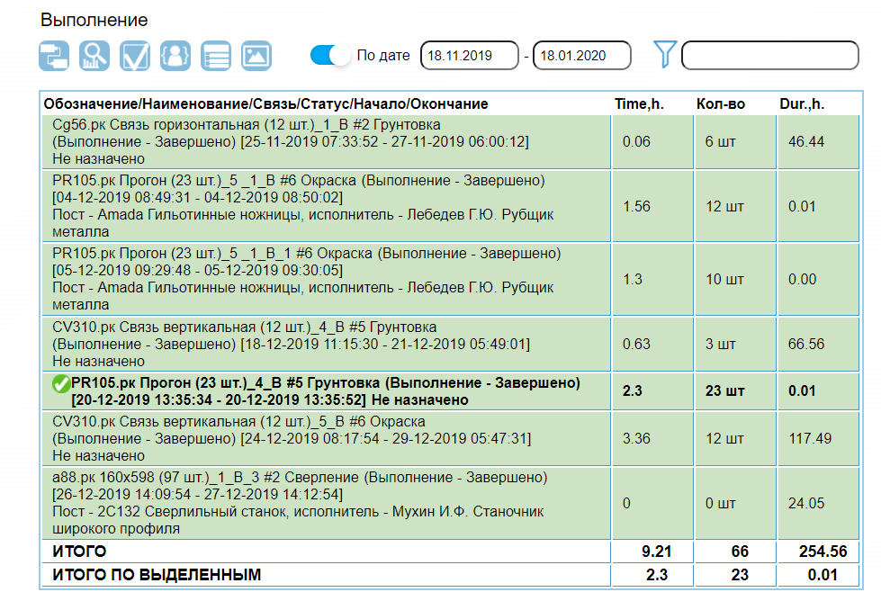 Выполнение Выводится список выполненных производственных заданий