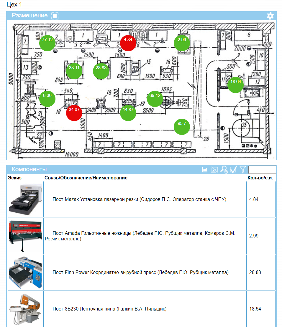 Загрузка Показывается размещение произвосдтвенных мощностец и их загруженность