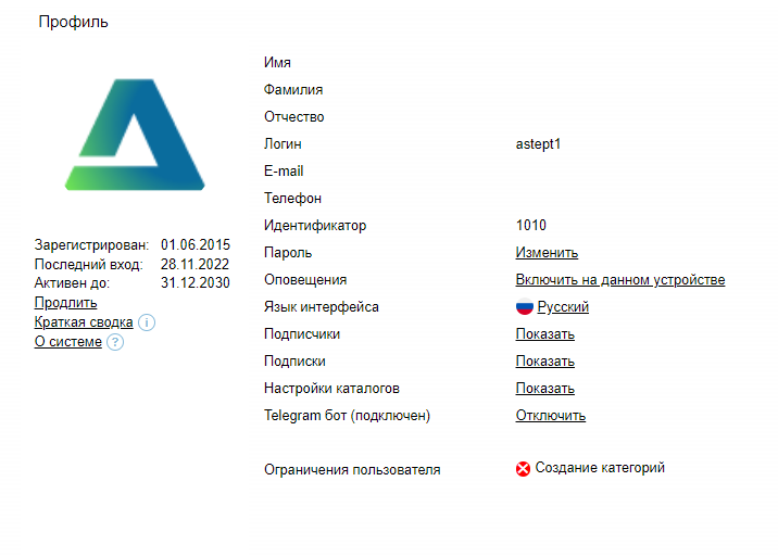 Пи нажатии на “Карандаш” можно откорректировать введенное ранее значение, а нажатие на “Глаз” сделает это поле видимым для других рядом с логином пользователя, который доступен всегда. Здесь же можно изменить пароль, выбрать язык интерфейса (поддерживается русский, английский и немецкий), увидеть ограничения в правах, и так как это показано в ведении приглашений.