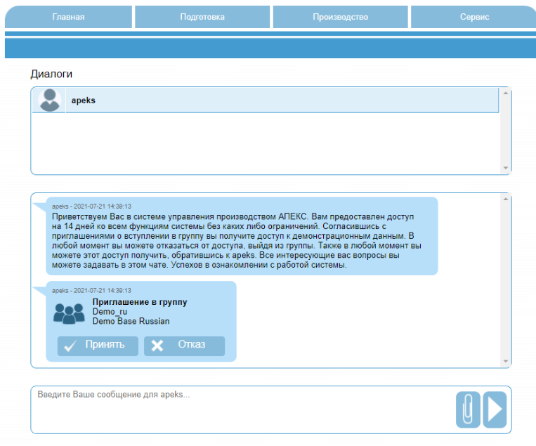 Важное замечание - длина логина и пароля должна быть не менее 6 символов и не более 30 и состоять из английских символов, цифр и специальных знаков. Если приглашение было использовано кем-то ранее, то нужно получить и использовать другое. Имя пользователя также должно быть уникальным в системе. При несоблюдении этих требований регистрация не пройдет. По успешной регистрации будет выведено окно, к котором требуется указать логин и назначенный пароль, а также поставить галочку, что вы не робот. Если логин и пароль указаны верно - вы в системе. При первом входе будет предложено подключиться к демонстрационным данным. Сообщение придет в чат в следующем виде.