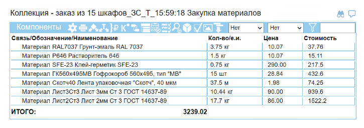 Расположена она, как видно на рисунке, среди кнопок в блоке «Компоненты» в коллекции. Работает она довольно просто. Производится проход по всем компонентам коллекции, из них берется их количество и умножается на цену одной компоненты.