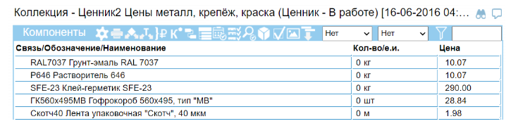 Цена компоненты выбирается из коллекций со связью «Ценник»,