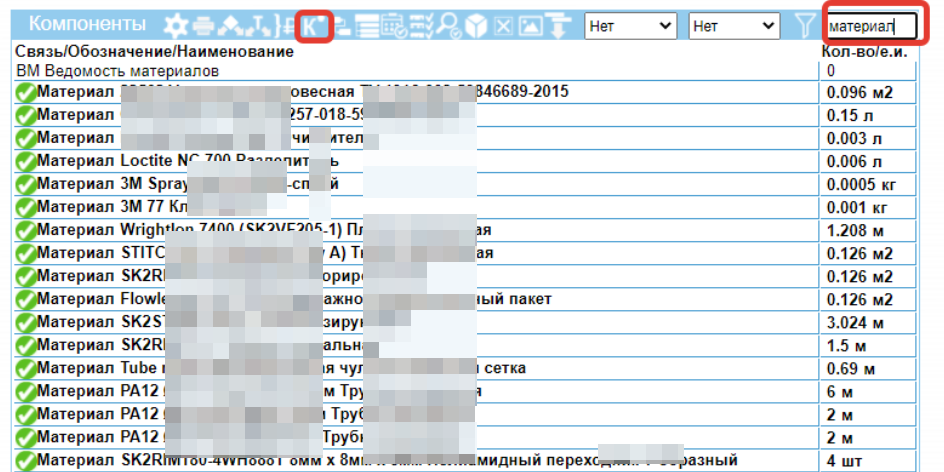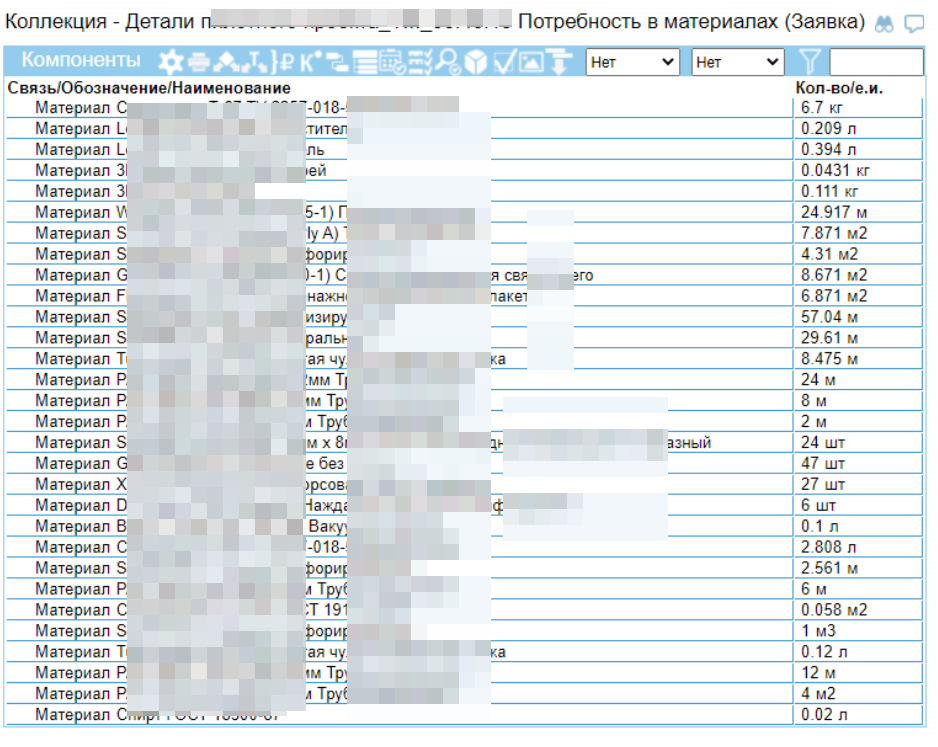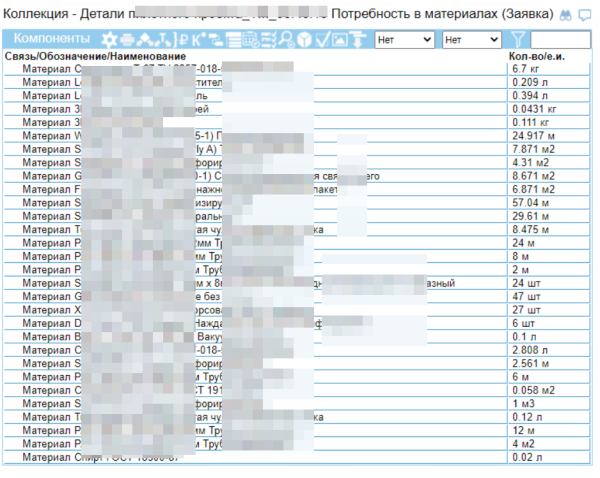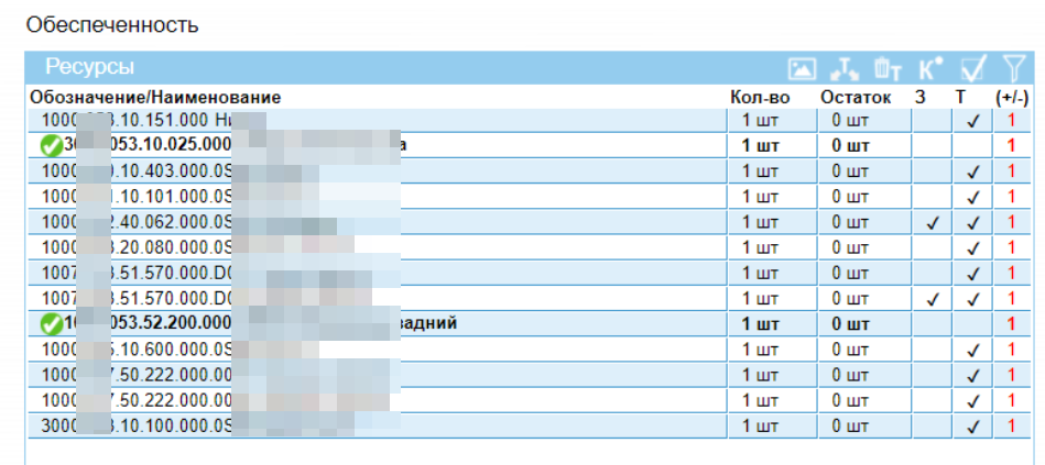 Мы получим коллекцию, содержащую потребность в материалах по выбранным нами позициям заказа и интересующим материалам. Для проверки обеспеченности выделяются нужные позиции и нажимается кнопка
