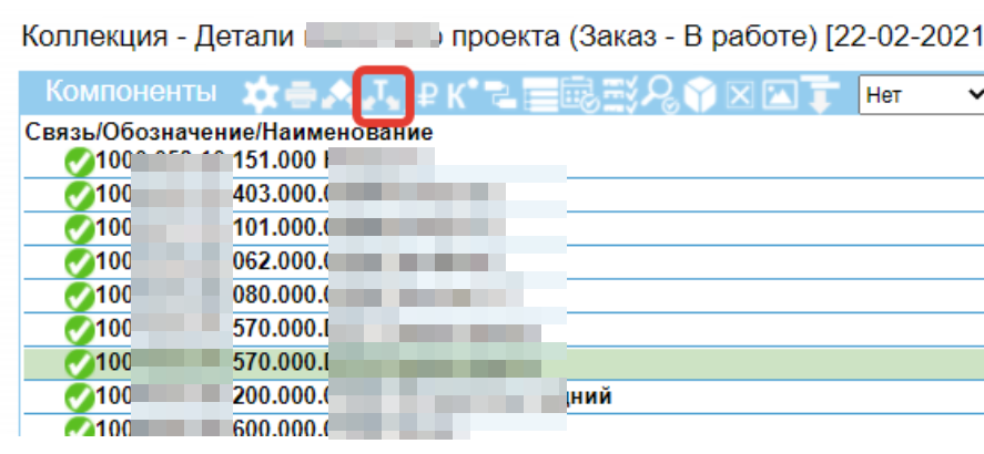 Наличие галочки в колонке “Т” означает, что у позиции есть технологический процесс и он привязан к этой позиции для этого заказа. Для привязки уже имеющегося технологического процесса к позициям их нужно выделить и нажать кнопку