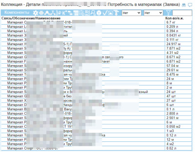 По этой команде формируется результата расчета, который записывается в блок “Коллекции” заказа. Это также коллекция, но содержащая и позиции заказа и все необходимые ресурсы, рассчитанные с учетом количества этой позиции. Для формирования потребности в материалах в поле фильтра следует указать значение “Материал”, выделить необходимые позиции и нажать кнопку “Создать коллекцию по выделенным”, согласившись с запросом на суммирование количества в рамках единицы измерения.