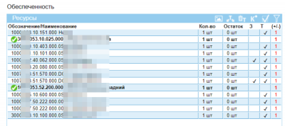 Мы получим коллекцию, содержащую потребность в материалах по выбранным нами позициям заказа и интересующим материалам. Для проверки обеспеченности выделяются нужные позиции и нажимается кнопка “Обеспеченность”. В результате будут выведено окно следующего вида